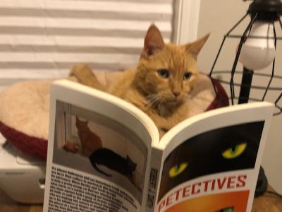 I’m saddened to announce the passing of my cat, Gatsby Smith. He lived to the ripe old age of seventeen and is survived by two cat brothers, a dog brother, and a human family. He was the inspiration for several books I’ve written that co-star an orange cat named Gatsby. The fictional Gatsby is a risk-taker, full of bravado and wisecracks. The personality of the real-life Gatsby was almost the exact opposite. He started with us as a skittish, well-behaved kitten and over his seventeen years developed into a lovable grumpy old cat.
